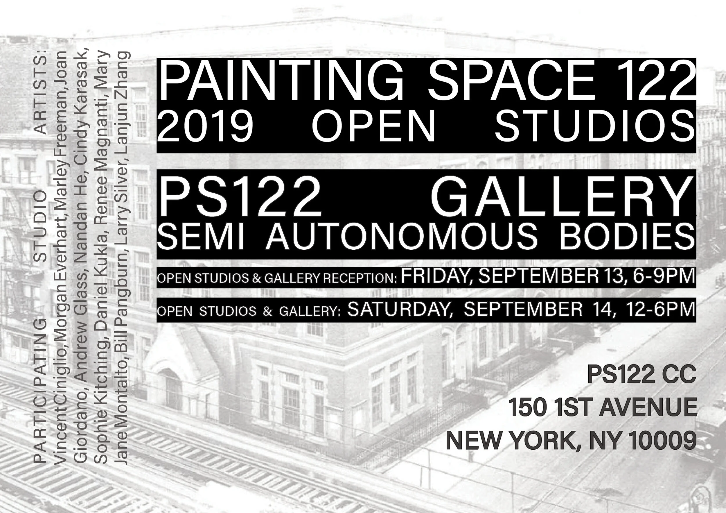 In the PS122 Gallery, Semi Autonomous Bodies, curated by gallery director Ian Cofre, will be on view from September 6th, 2019 - October 6th, 2019 with an opening reception will be held alongside the Open Studios on Friday, September 13th, 2019 from 6-9pm. Other organizations in the PS122 Community Center building are Performance Space 122, Mabou Mines, Movement Space, and the Alliance for Positive Change. PS122 is on First Avenue and 9th street in Manhattan, close to the New Museum and other Lower East Side Galleries (near the L train stop of First Avenue and on the 6 train stop of Astor Place).